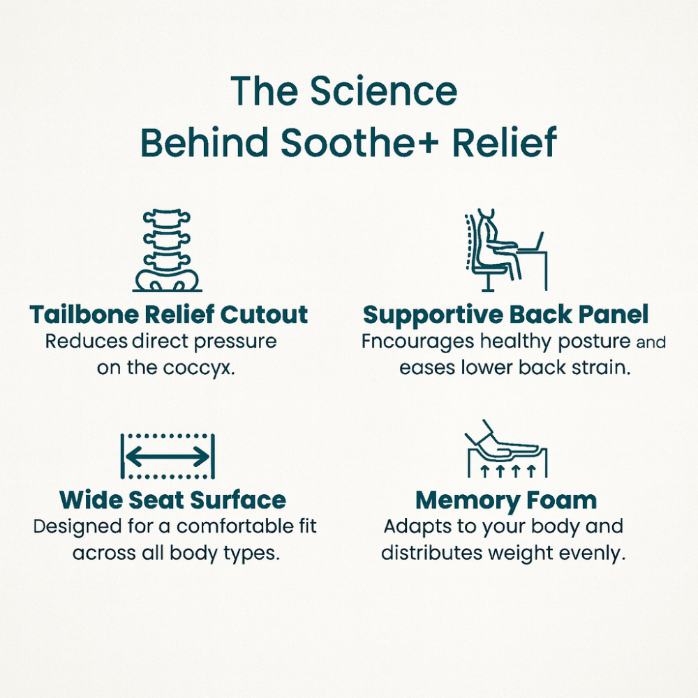 Most cushions either flatten quickly or only support one area. Soothe+ combines high-density foam with a coccyx cut-out and a raised lumbar panel designed to encourage upright sitting. This design helps reduce tailbone and sciatic nerve pressure while keeping hips more level.
